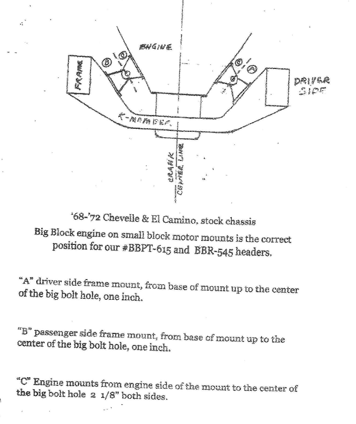 We designed this header with the engine in the stock location setting on small block frame stands for the front motor mounts with Moroso #62510 solid motor mounts or Prothane #7-505 polyurethane motor mounts. It has 2 tubes on each side that go around the frame which will require that you trim your inner fender wells for clearance. It also allowed us to get the best possible ground clearance, oil pan room and spark plug access.